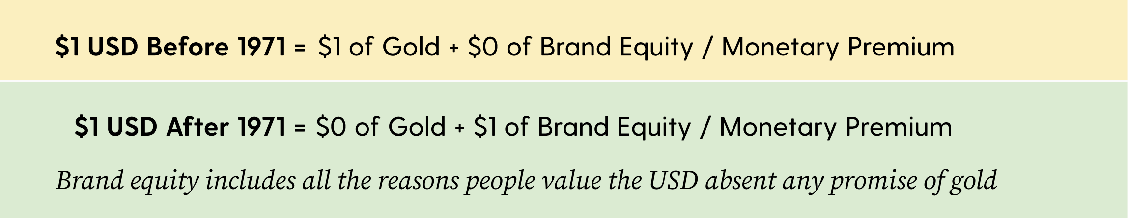 But then, suddenly, all at once, in August 1971, the dollar’s brand equity went from absolute zero to one whole dollar per dollar. Brand equity instantly went from 0% to 100%.