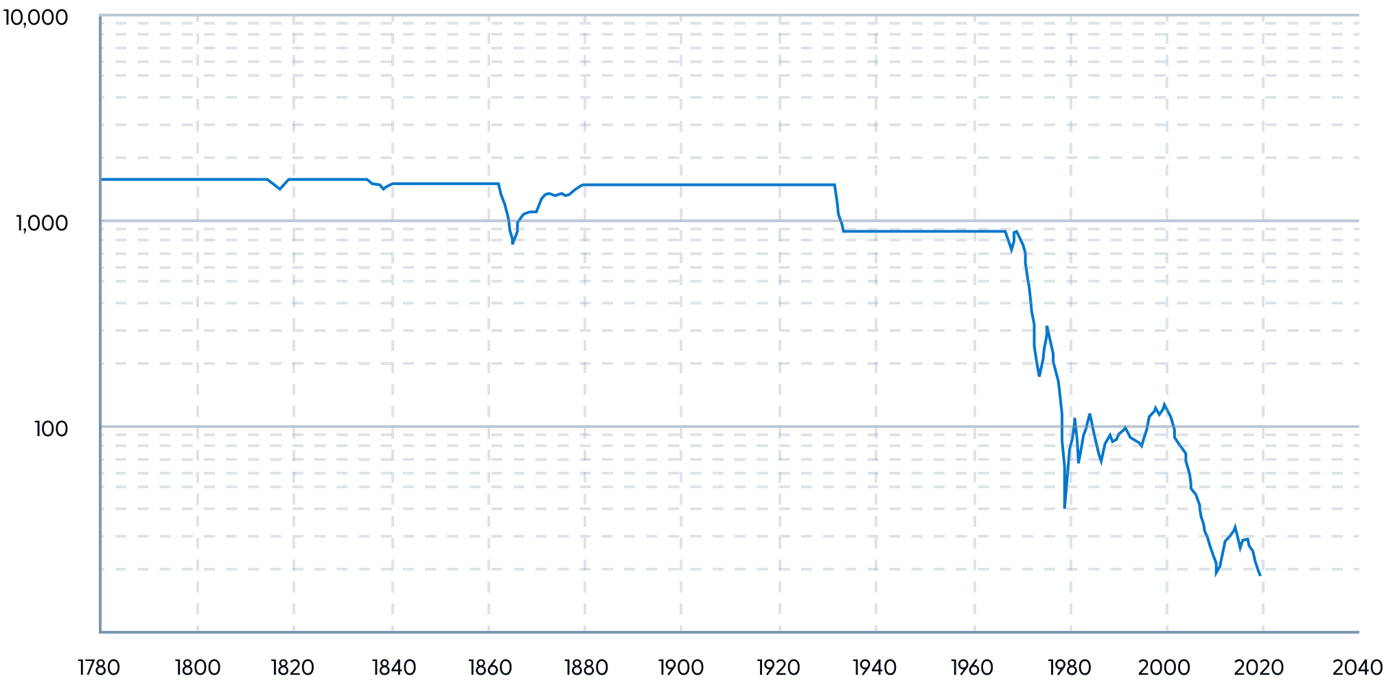 The purchasing power of a dollar has fallen since it became 100% brand equity. Back in 1971, a dollar bought about 900 milligrams of gold.