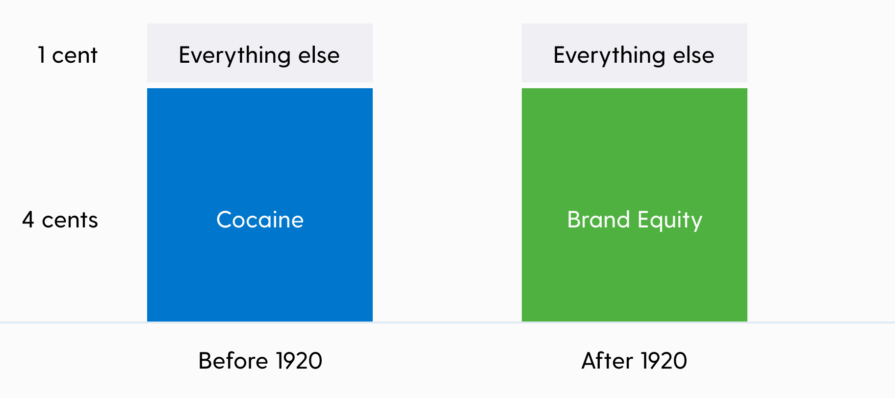 When Coke lost its most potent ingredient, its brand equity actually went up — way way up. This is just a fact of math. The product itself became worth less because of the removal of its most valuable ingredient, while the price did not drop.