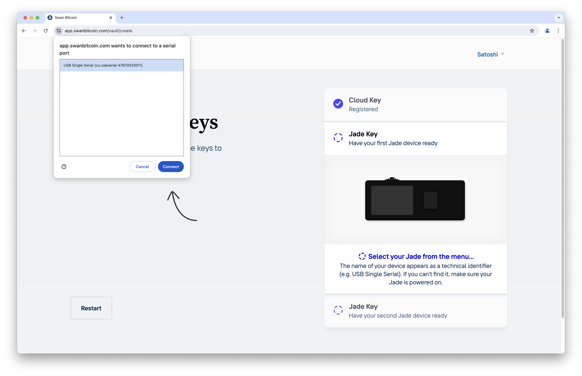During the first health check on each Jade, Swan Vault will register your recovery kit’s wallet information into the device. This enables your Jades to validate addresses associated with your Vault.