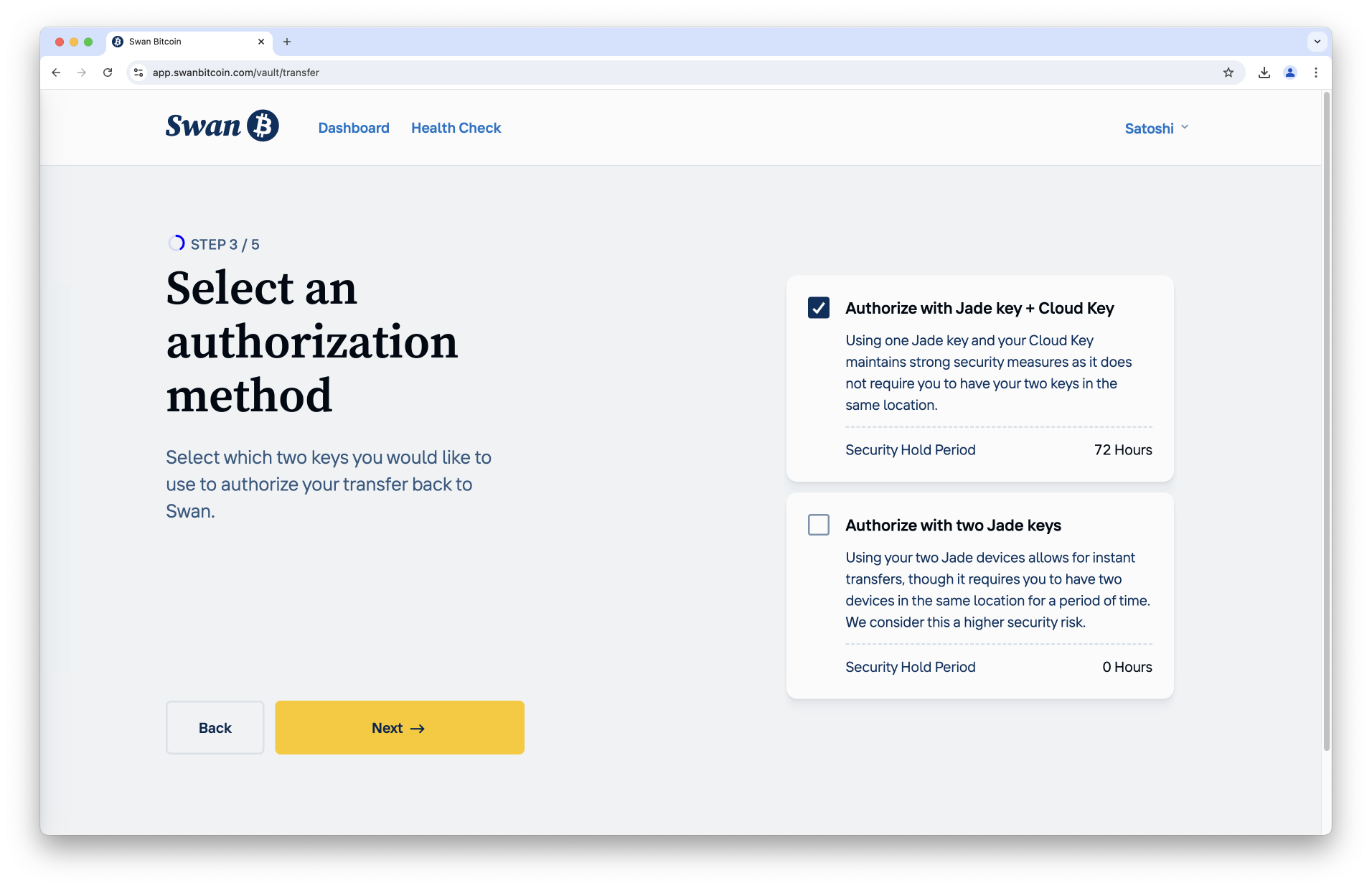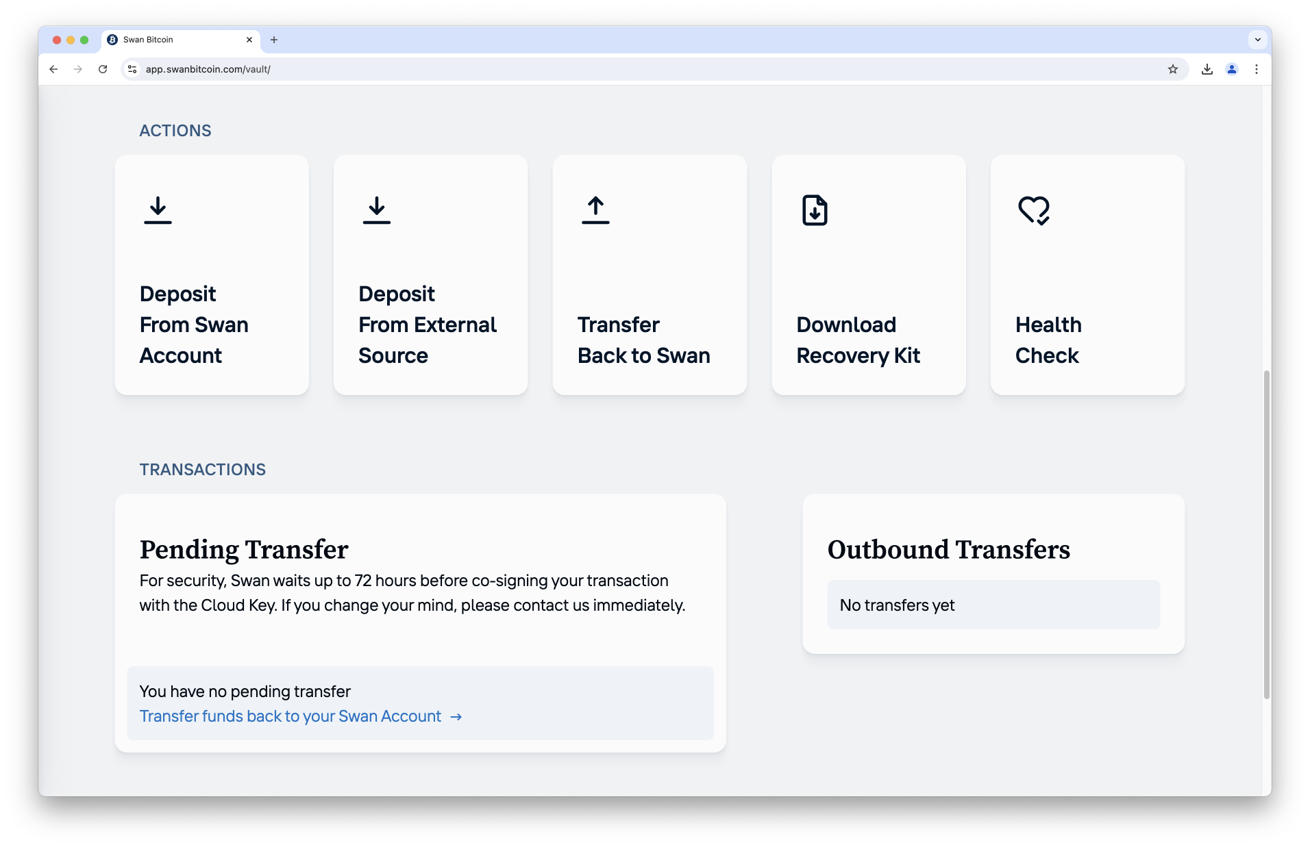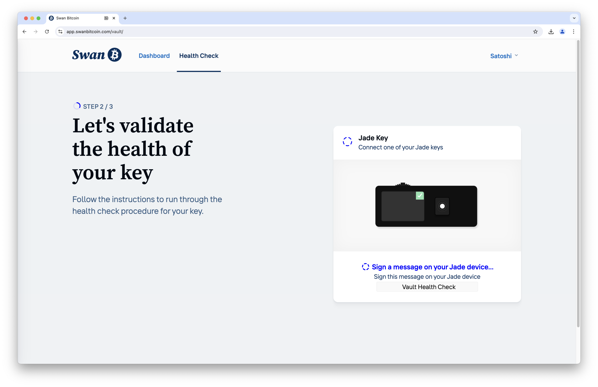 Swan Vault is designed for long-term savings, so you probably won’t transfer Bitcoin out of it frequently. However, it’s essential to ensure that your Jades are functioning properly and that you still have the keys needed to approve transactions. We recommend performing a health check every six months.