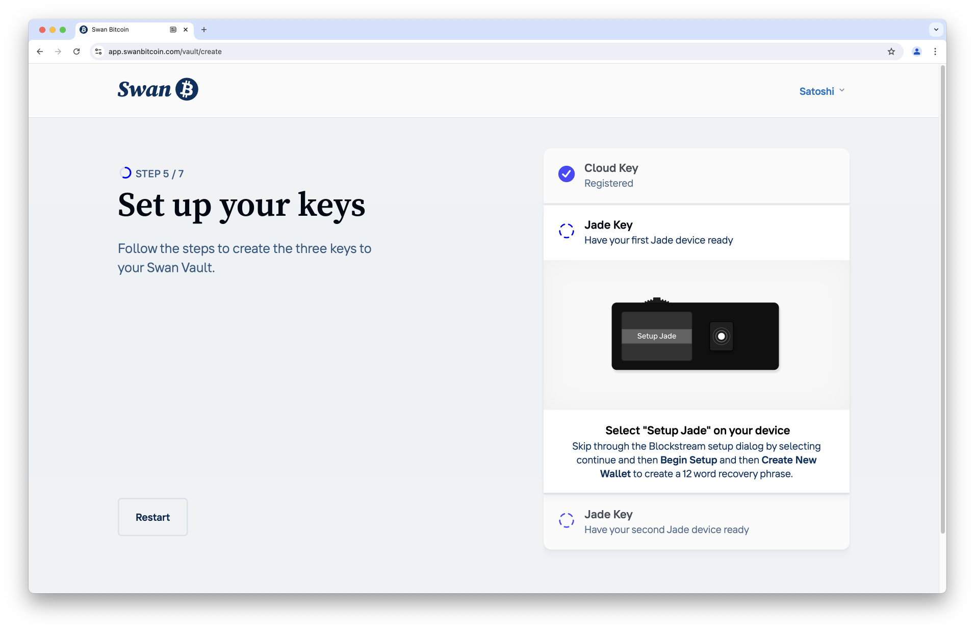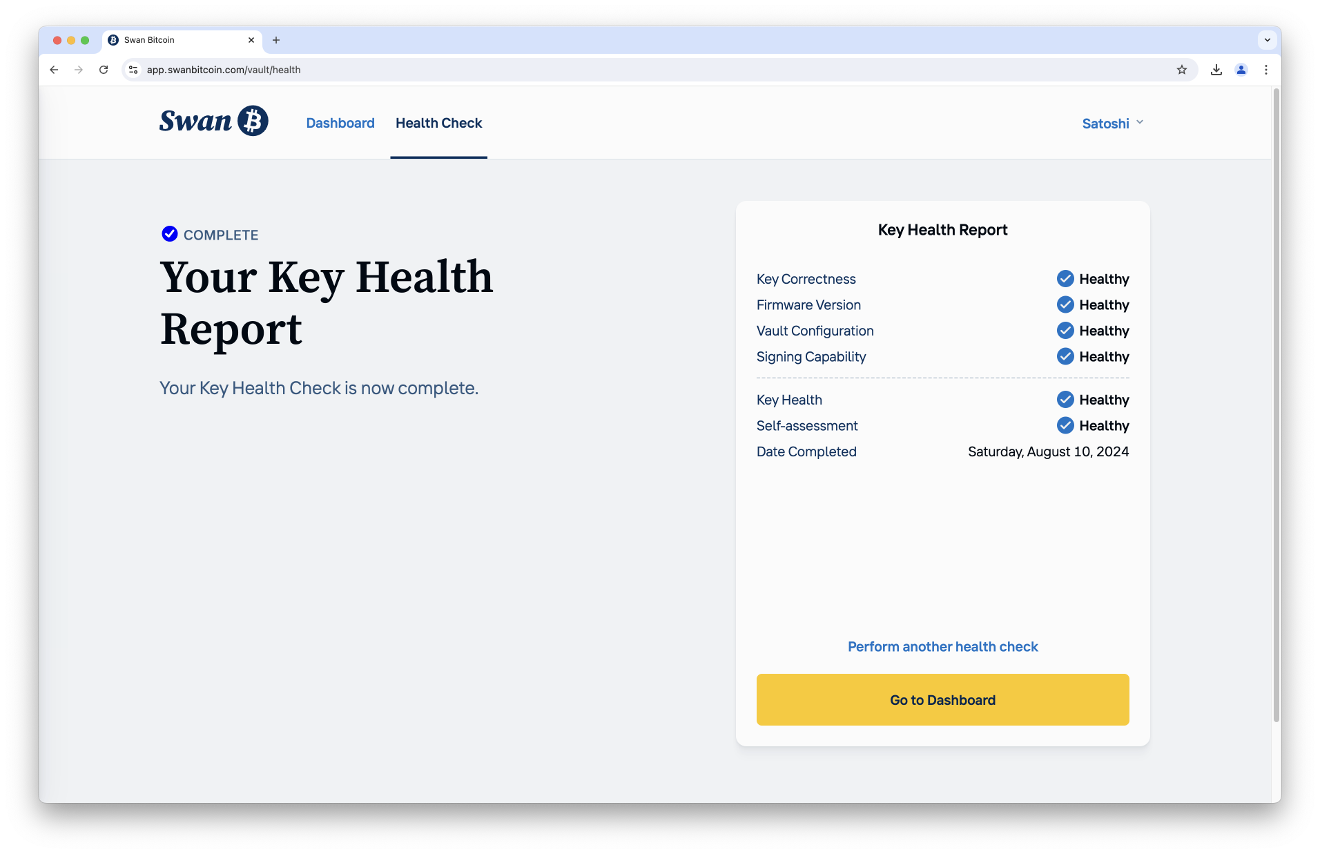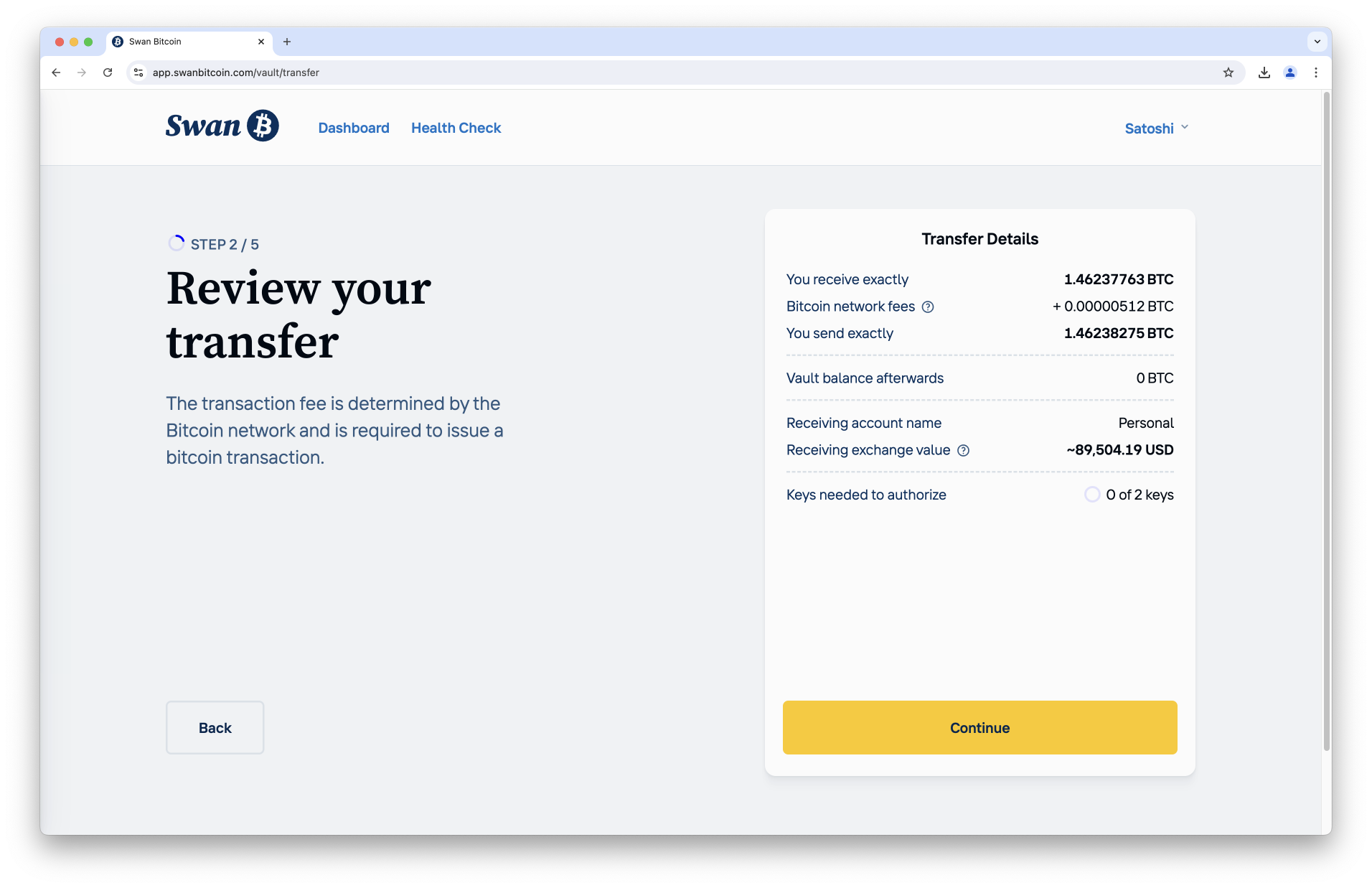 Swan Vault is designed for long-term savings, so you probably won’t transfer Bitcoin out of it frequently. However, it’s essential to ensure that your Jades are functioning properly and that you still have the keys needed to approve transactions. We recommend performing a health check every six months.