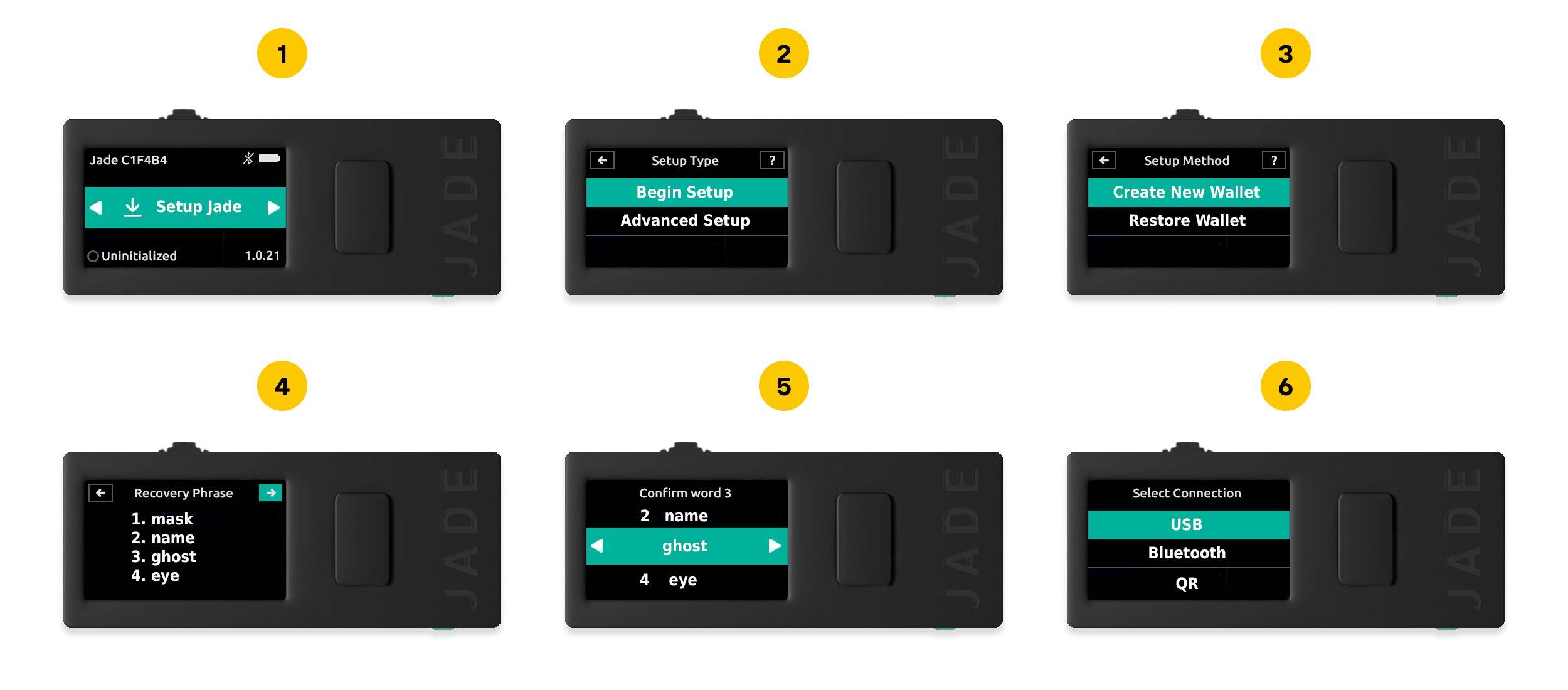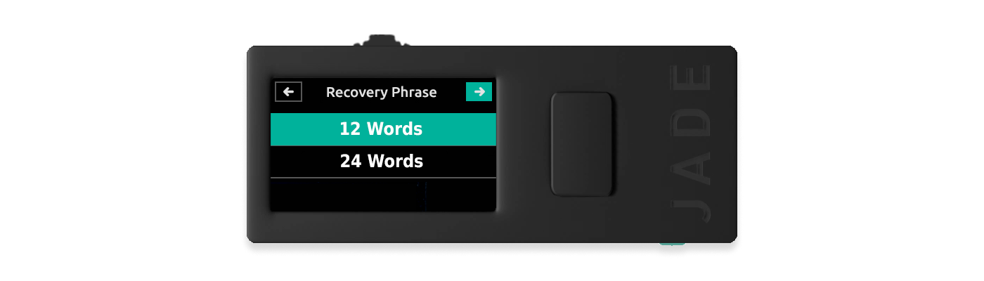 By clicking ‘Begin Setup’, your Jade will generate a 12-word recovery phrase. Once you’ve written down and confirmed your recovery phrase, the Jade will never display it again. Be sure to write down the correct words in the right order.
