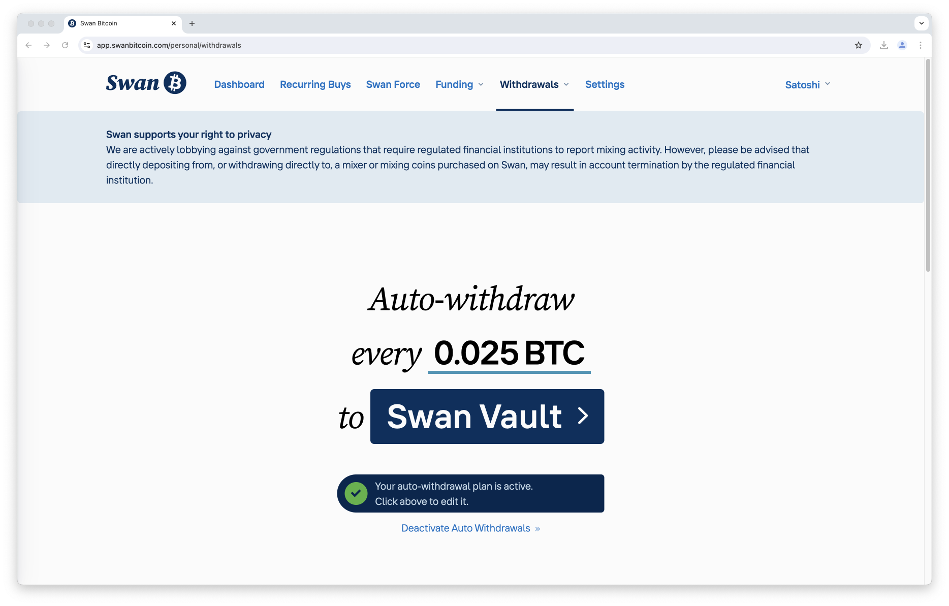 Swan offers automatic withdrawals, eliminating the need to manually copy and paste addresses. Configure this feature once, and your Bitcoin will be sent to a new address each time, avoiding address reuse.