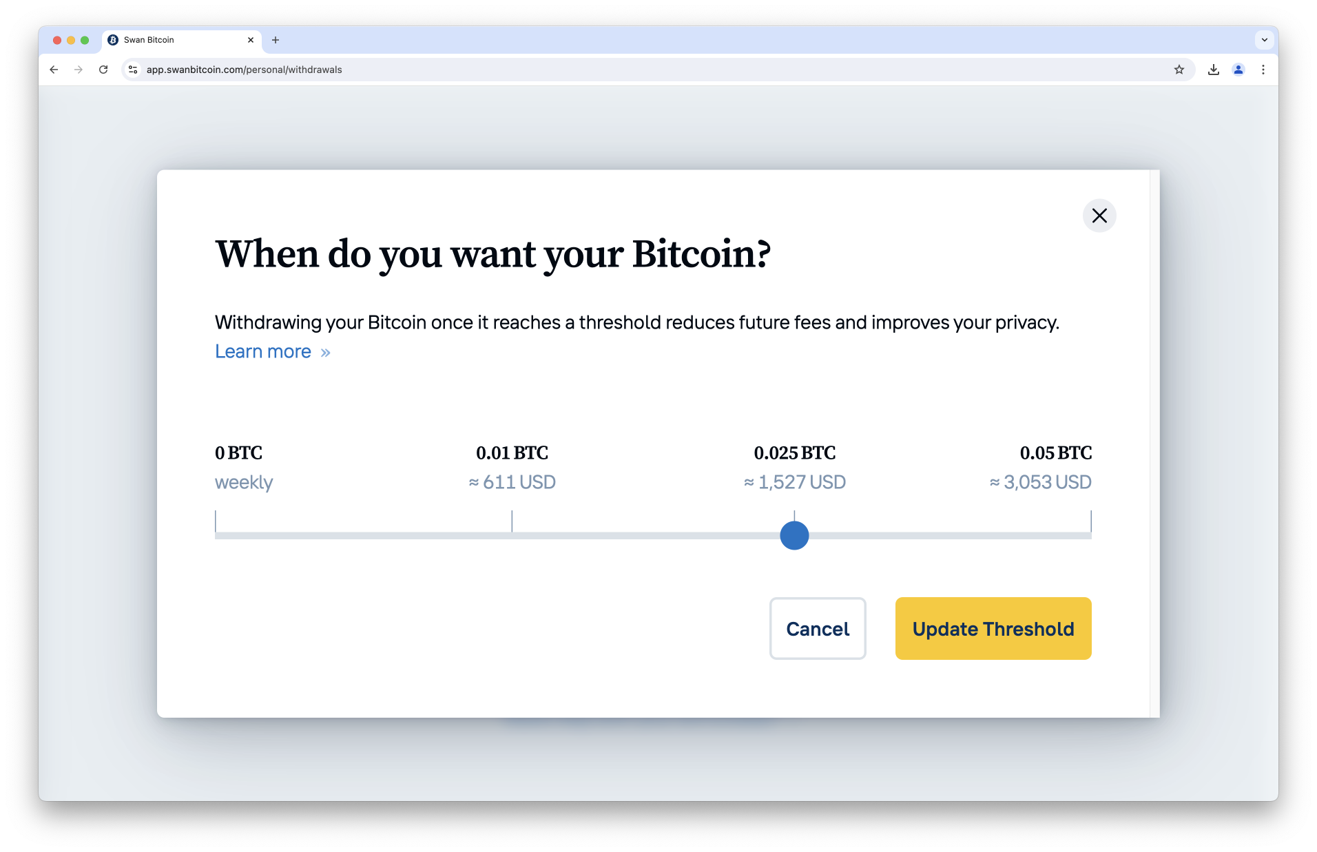 Swan will automatically transfer funds to your Vault once your balance reaches the selected threshold. We recommend a minimum of 0.01 BTC to minimize future transaction fees. The higher the threshold, the greater the savings over time.