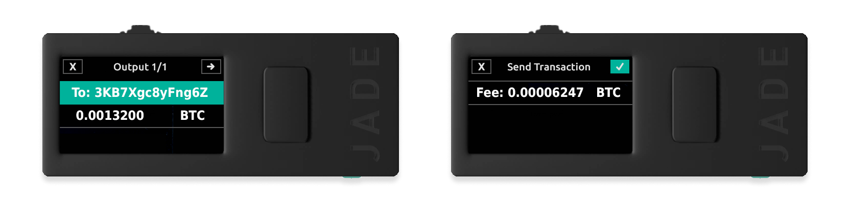 Before approving transfers, always verify the addresses and amounts on the Jade’s screen.