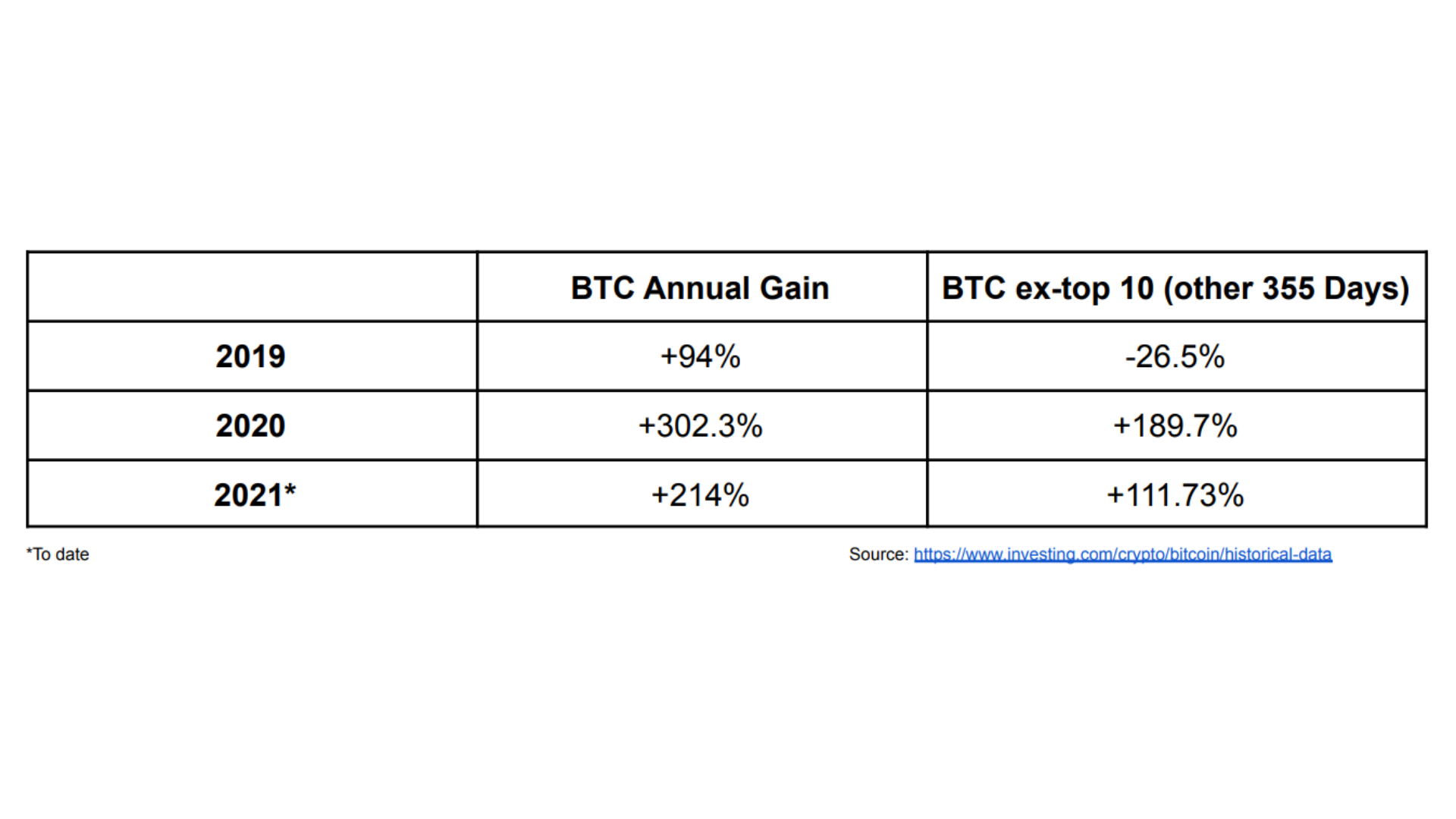 Beyond the emotional component, another reason trading bitcoin is a risky endeavor is historically a majority of Bitcoin’s annual gains come from ~10 days every year. Said differently, traders need to manage to time it right on 10 random days each year.