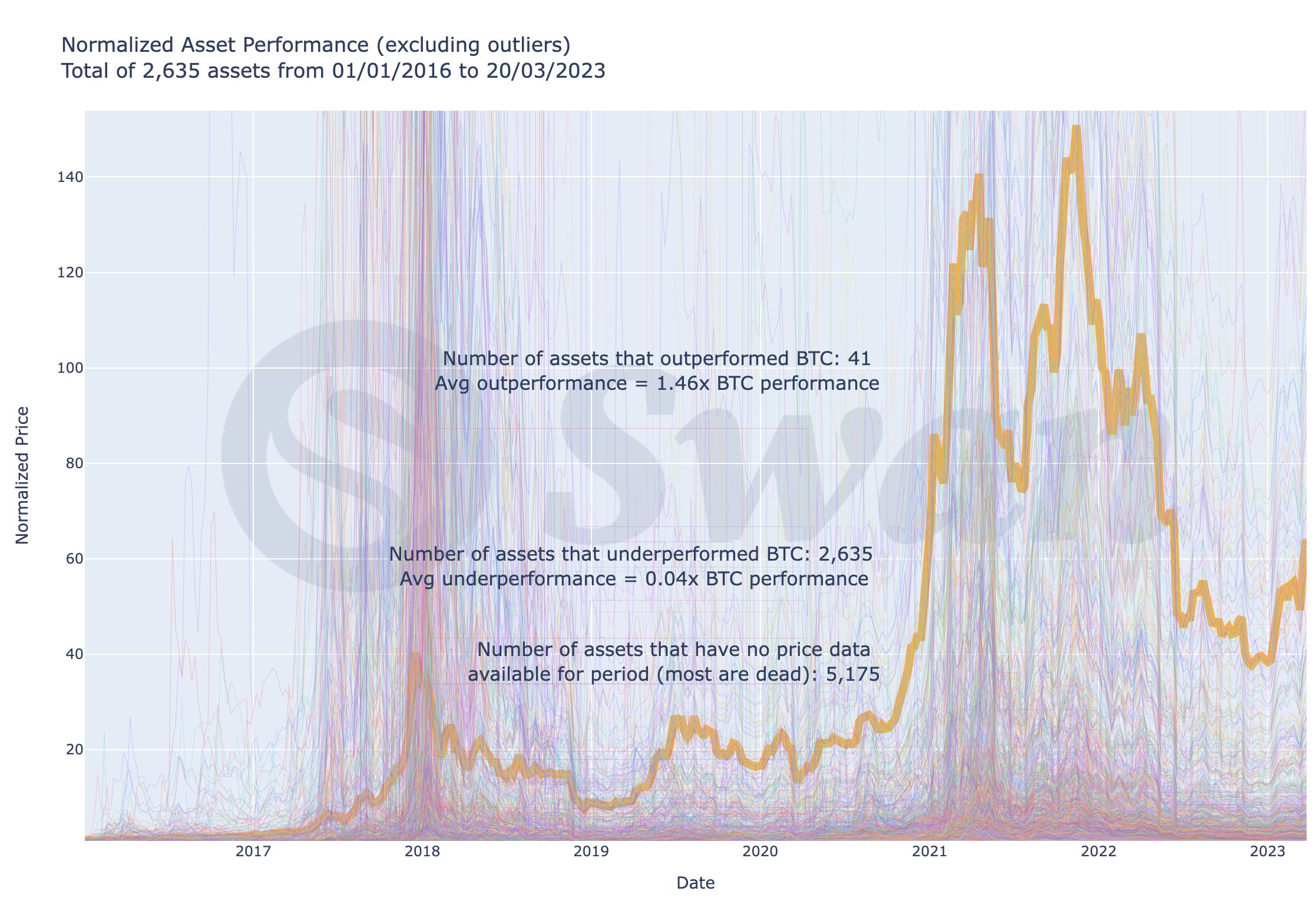 In 2023, I conducted an analysis of almost 8,000 altcoins’ performance since 2016. Forty-one (or one-half of one percent) outperformed Bitcoin, with an average outperformance of 1.46 times its performance. 2,635 underperformed and on average returned 0.04x BTC’s performance — That’s a 96% underperformance on average. And what of the remaining 5,324? They had no trading volume — effectively worth nothing. The bottom right corner is where shitcoins go to die.